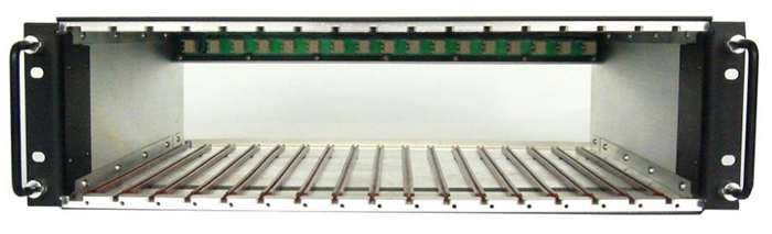這是一個(gè)標(biāo)準(zhǔn)的19英寸寬gsdt-ch底盤。底盤是3個(gè)機(jī)架單元高有17槽容納所有模塊。背板接口可以提供模塊間的通信和分布。
